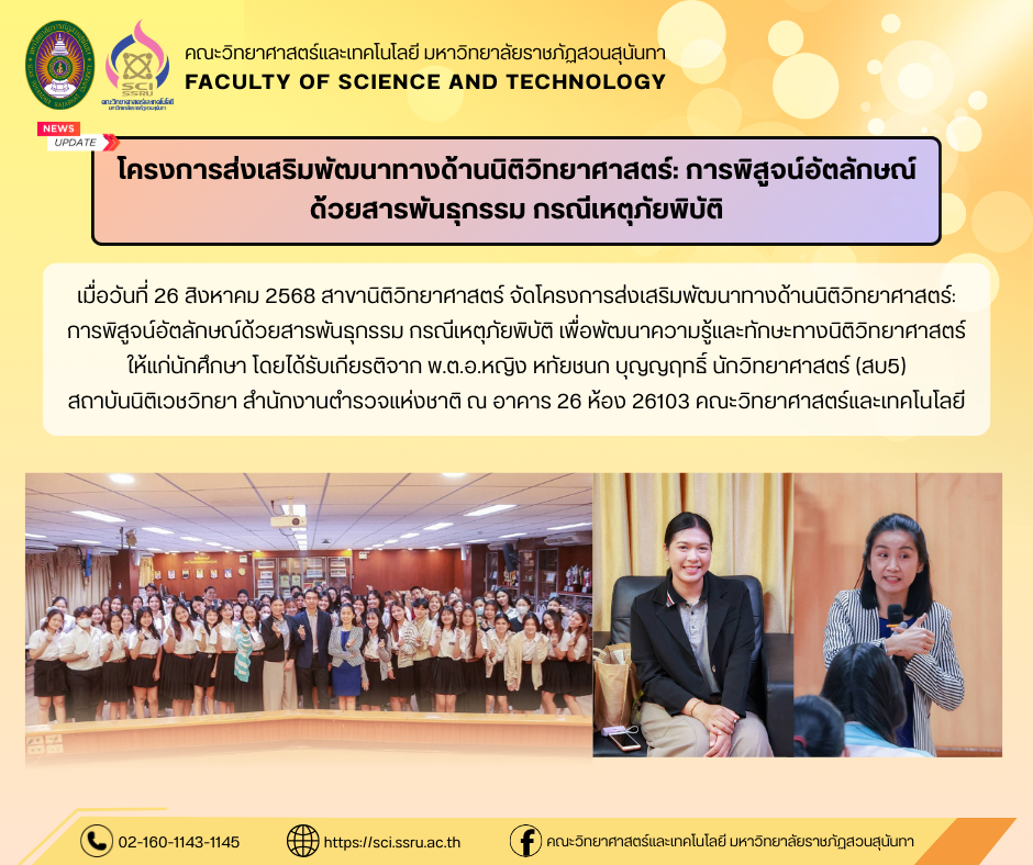 เมื่อวันที่ 26 สิงหาคม 2568 สาขานิติวิทยาศาสตร์ จัดโครงการส่งเสริมพัฒนาทางด้านนิติวิทยาศาสตร์: การพิสูจน์อัตลักษณ์ด้วยสารพันธุกรรม กรณีเหตุภัยพิบัติ เพื่อพัฒนาความรู้และทักษะทางนิติวิทยาศาสตร์ให้แก่นักศึกษา โดยได้รับเกียรติจาก พ.ต.อ.หญิง หทัยชนก บุญญฤทธิ์ นักวิทยาศาสตร์ (สบ5) สถาบันนิติเวชวิทยา สำนักงานตำรวจแห่งชาติ ณ อาคาร 26 ห้อง 26103 คณะวิทยาศาสตร์และเทคโนโลยี มหาวิทยาลัยราชภัฏสวนสุนันทา