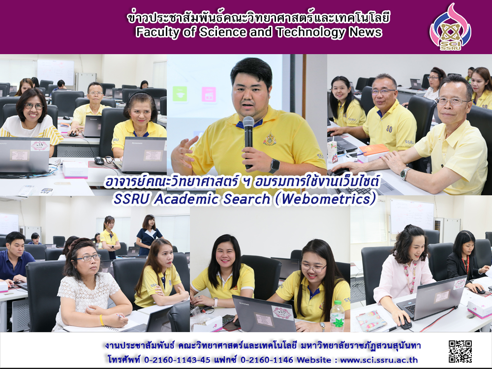 วันที่ 24 พฤษภาคม 2562 ที่ผ่านมา คณะวิทยาศาสตร์และเทคโนโลยี ได้จัดอบรมการเข้าใช้งานเว็บไซต์ SSRU Academic Search Webometrics) โดย คุณณัฐ พลอยอ่อง และทีมงานจากสำนักวิทยบริการและเทคโนโลยีสารสนเทศ มหาวิทยาลัยราชภัฏสวนสุนันทา ที่ให้ความอนุเคราะห์ ในการอบรมคณาจารย์ของคณะวิทยาศาสตร์ฯ จำนวน 50 คน ทั้งนี้เพื่อให้การดำเนินงานเป็นไปตามแผนการขับเคลื่อนยุทธศาสตร์ของมหาวิทยาลัย และบรรลุตามเป้าหมายตัวชี้วัดที่ 5 ยุทธศาสตร์ที่ 3 ด้านเทคโนโลยีสารสนเทศและวิทยบริการ