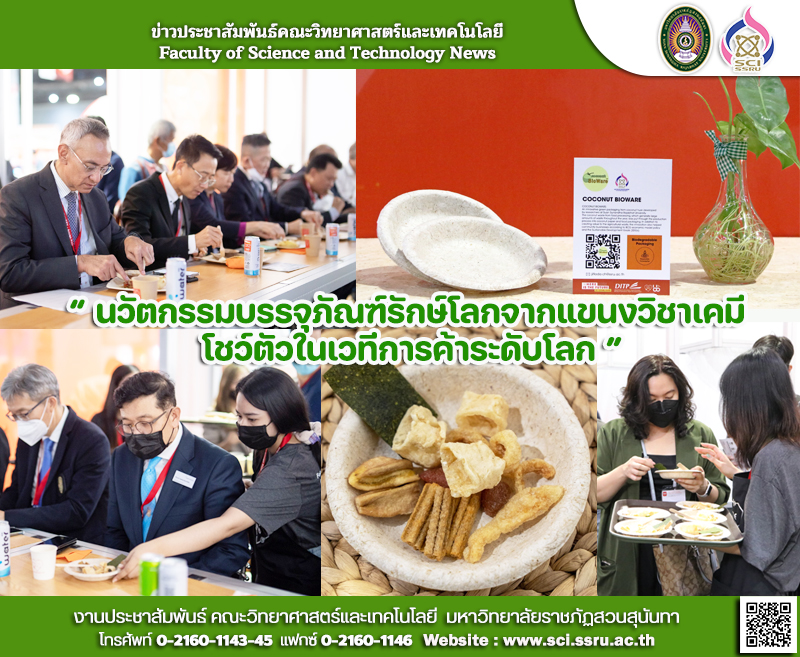 แขนงวิชาเคมี สาขาวิทยาศาสตร์และนวัตกรรม คณะวิทยาศาสตร์และเทคโนโลยี ได้รับเชิญให้นำนวัตกรรม “COCONUT BIOWARE ภาชนะรักษ์โลกจากเปลือกมะพร้าวเหลือทิ้ง” ไปร่วมจัดแสดงในงาน THAIFEX-ANUGA ASIA 2022 งานแสดงสินค้าอาหารและเครื่องดื่มที่ยิ่งใหญ่และครบวงจรที่สุดแห่งเอเชีย ซึ่งจัดขึ้นโดย ความร่วมมือระหว่างกรมส่งเสริมการค้าระหว่างประเทศ (DITP) กระทรวงพาณิชย์ หอการค้าไทย (TCC) และโคโลญเมสเซ่ (KM) ประเทศเยอรมนี ระหว่างวันที่ 24-28 พฤษภาคม 2565 ณ อิมแพ็ค เมืองทองธานี