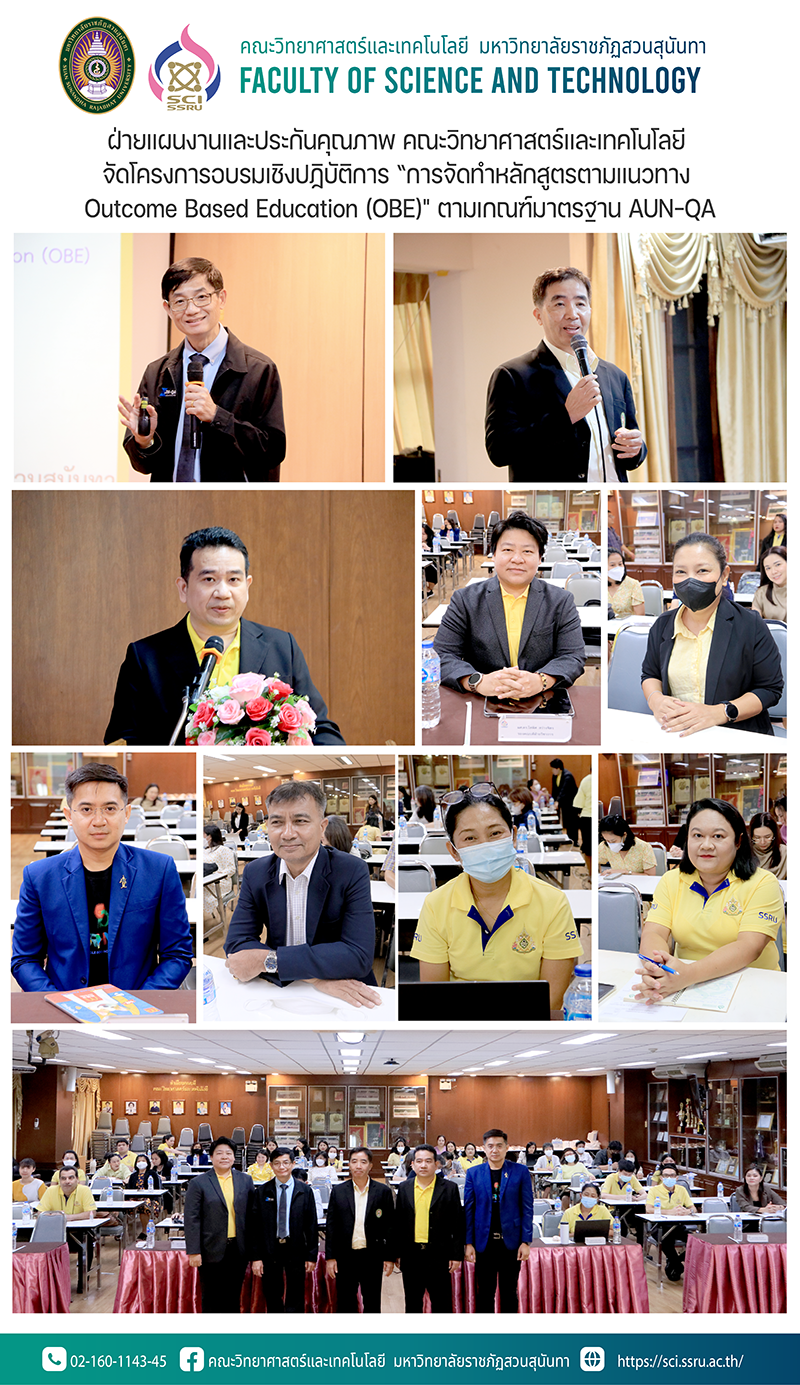 วันจันทร์ ที่  27 พฤษภาคม 2567 ฝ่ายแผนงานและประกันคุณภาพ คณะวิทยาศาสตร์และเทคโนโลยี ได้จัดโครงการอบรมเชิงปฏิบัติการ “การจัดทำหลักสูตรตามแนวทาง Outcome Based Education (OBE)" ตามเกณฑ์มาตรฐาน AUN-QA โดยมี รองศาสตราจารย์ ดร.ชัยศรี ธาราสวัสดิ์พิพัฒน์ คณบดีคณะวิทยาศาสตร์และเทคโนโลยี กล่าวเปิดโครงการ และ ผู้ช่วยศาสตราจารย์ ดร.ชินวัฒน์ ศาสนนันทน์ รองคณบดีฝ่ายแผนงานและประกันคุณภาพ กล่าวรายงานความเป็นมาของโครงการ โดยได้รับเกียรติจาก รองศาสตราจารย์ ดร.วิเชียร ชุติมาสกุล อาจารย์ประจำคณะเทคโนโลยีสารสนเทศ มหาวิทยาลัยเทคโนโลยีพระจอมเกล้าธนบุรี ผู้เชี่ยวชาญ IQA, TQR, สมศ., AUN-QA, EdPEx, TQA มาเป็นวิทยากรบรรยายให้ความรู้ในครั้งนี้ โดยมี ผู้บริหาร คณาจารย์ และเจ้าหน้าที่ที่เกี่ยวข้องเข้าร่วมโครงการฯ ณ ห้องประชุม 26103 ชั้น 1 อาคาร 26 คณะวิทยาศาสตร์และเทคโนโลยี มหาวิทยาลัยราชภัฏสวนสุนันทา