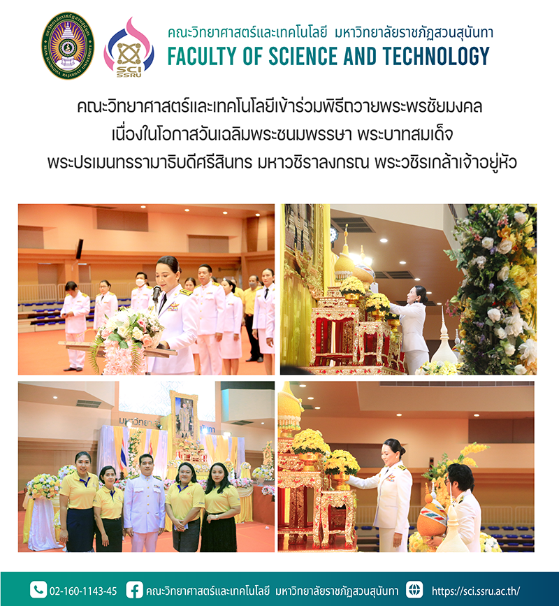วันที่ 27 กรกฎาคม 2566 รองศาสตราจารย์ ดร.ชัยศรี ธาราสวัสดิ์พิพัฒน์ คณบดีคณะวิทยาศาสตร์และเทคโนโลยีมอบหมายให้ ผู้ช่วยศาสตราจารย์ ดร.ชินวัฒน์ ศาสนนันทน์ รองคณบดีฝ่ายแผนงานและประกันคุณภาพ เข้าร่วมพิธีถวายพระพรชัยมงคล เนื่องในโอกาสวันเฉลิมพระชนมพรรษา พระบาทสมเด็จพระปรเมนทรรามาธิบดีศรีสินทร มหาวชิราลงกรณ พระวชิรเกล้าเจ้าอยู่หัว พร้อมด้วยบุคลากรคณะวิทยาศาสตร์และเทคโนโลยี โดยมี รองศาสตราจารย์ ดร.ชุติกาญจน์ ศรีวิบูลย์ อธิการบดีมหาวิทยาลัยราชภัฏสวนสุนันทา เป็นประธานในพิธี ณ โรงยิม ชั้น 4 อาคารศูนย์สุขภาพและกีฬา