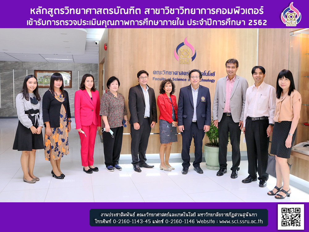 วันพฤหัสบดี ที่ 27 สิงหาคม 2563 ณ ห้องประชุม 26103 ชั้น 1 อาคารคณะวิทยาศาสตร์และเทคโนโลยี หลักสูตรวิทยาศาสตรบัณฑิต สาขาวิชาวิทยาการคอมพิวเตอร์ คณะวิทยาศาสตร์และเทคโนโลยี มหาวิทยาลัยราชภัฏสวนสุนันทา ได้เข้ารับการตรวจประเมินคุณภาพการศึกษาภายใน ประจำปีการศึกษา 2562 โดยได้รับเกียรติจากผู้ทรงคุณวุฒิภายนอก จำนวน 3 ท่าน ได้แก่ อาจารย์ ดร.ทรงพล นคเรศเรืองศักดิ์ (ประธานกรรมการ) ผู้ช่วยศาสตราจารย์ ดร.สุวิมล วงศ์สิงห์ทอง(กรรมการ) ผู้ช่วยศาสตราจารย์วุฒิพงษ์ เขื่อนดิน (กรรมการ) และนางสาวพิลาวรรณ กองทองนอก (เลขานุการ) ทั้งนี้ เพื่อเป็นการประเมินผลการดำเนินงานของหลักสูตรตามรอบปีการศึกษา 2562 และนำผลการประเมินที่ได้มาพัฒนาหลักสูตรสาขาวิชาต่อไป