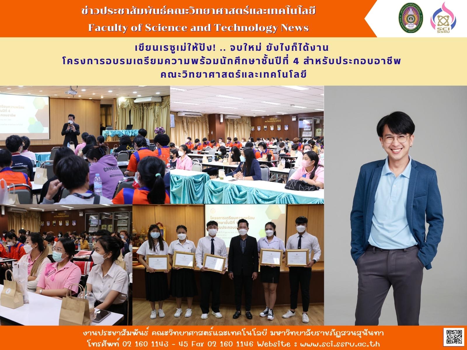 ฝ่ายกิจการนักศึกษาและศิลปวัฒนธรรม คณะวิทยาศาสตร์และเทคโนโลยี จัดโครงการอบรมเตรียมความพร้อมนักศึกษาชั้นปีที่ 4 สำหรับประกอบอาชีพ เพื่อเป็นการส่งเสริมนักศึกษาให้มีทักษะที่จำเป็นในศตวรรษที่ 21 ด้านทักษะชีวิตและอาชีพ สามารถนำความรู้ที่ได้ไปพัฒนาตนเอง และสร้างความมั่นใจให้นักศึกษา ในด้านการสมัครงาน การเขียนเรซูเม่ และการสัมภาษณ์งาน ได้รับเกียรติจาก คุณชิตปภพ ประเสริฐไพฑูรย์ บริษัท JOBTOPGUN มาเป็นวิทยากร ในวันพฤหัสบดีที่ 27 ตุลาคม 2565 ณ ห้องประชุม 26103 ชั้น 1 คณะวิทยาศาสตร์และเทคโนโลยี โดย ผู้ช่วยศาสตราจารย์ ดร. คมกฤช รัตตะมณี รองคณบดีฝ่ายกิจการนักศึกษา กล่าวเปิดงาน พร้อมมอบประกาศนียบัตรแก่คณะกรรมการสโมสรนักศึกษาชั้นที่ 4 ซึ่งช่วยเหลืองานกิจกรรมของคณะ และมหาวิทยาลัย