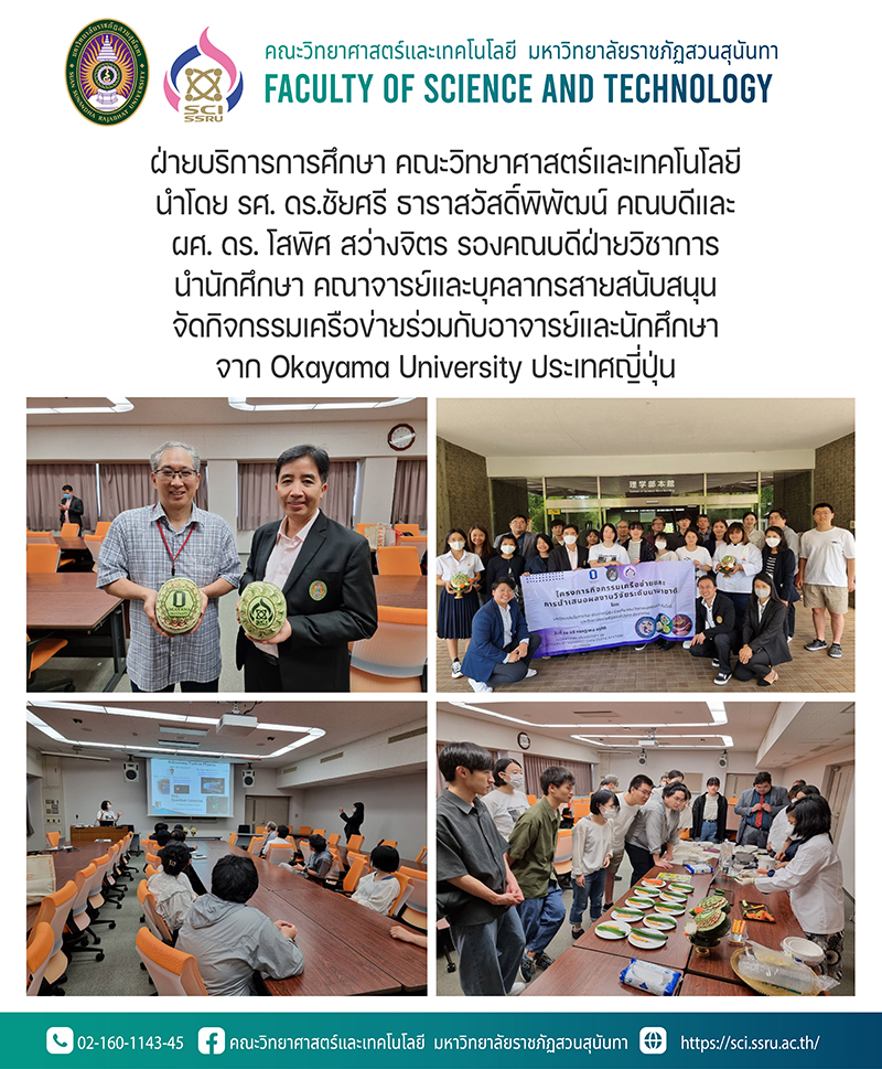 ฝ่ายบริการการศึกษา คณะวิทยาศาสตร์และเทคโนโลยีนำโดยรองศาสตราจารย์ ดร.ชัยศรี ธาราสวัสดิ์พิพัฒน์ คณบดีและผู้ช่วยศาสตรจารย์ ดร. โสพิศ สว่างจิตร รองคณบดีฝ่ายวิชาการนำนักศึกษา คณาจารย์และบุคลากรสายสนับสนุนจัดกิจกรรมเครือข่ายร่วมกับอาจารย์และนักศึกษาจาก Okayama University ประเทศญี่ปุ่น โดยเป็นการสาธิตและทำกิจกรรมร่วมกัน 3 กิจกรรม ได้แก่ การทำขนมไทย บัวลอยสามสีและการแกะสลักผักและผลไม้ โดยผู้ช่วยศาสตราจารย์จิราพร วีณุตตรานนท์และนางสาวขนิสา ดวงสุดา สาขาวิชาคหกรรมศาสตร์ กิจกรรมการทำน้ำมันนวดสมุนไพรโดยอาจารย์ ดร.พลอยทราย โอฮาม่า แขนงวิชาเคมี ซึ่งกิจกรรมเครือข่ายที่จัดขึ้นในครั้งนี้ประสานงานโดยผศ.ดร.วนิดา วอนสวัสดิ์ ทั้งนี้ยังได้มีการหารือร่วมกันระหว่างทั้ง 2 มหาวิทยาลัยเกี่ยวกับการแลกเปลี่ยนการจัดการเรียนการสอนของอาจารย์และนักศึกษารวมทั้งการทำวิจัยด้านเคมีและชีววิทยาร่วมกัน ณ Okayama University เมือง Okayama โดยกิจกรรมดังกล่าวนี้เป็นส่วนหนึ่งของโครงการกิจกรรมเครือข่ายและการนำเสนอผลงานวิจัยระดับนานาชาติ ซึ่งจัดขึ้นระหว่างวันที่ 24-28 กรกฎาคม 2566