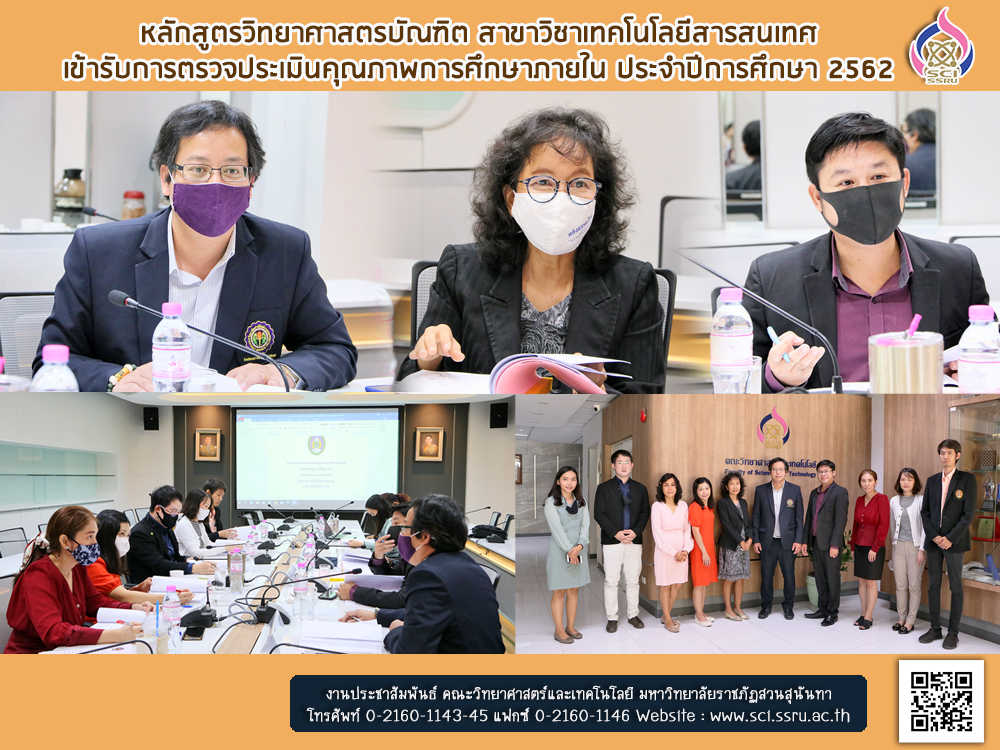 วันศุกร์ ที่ 28 สิงหาคม 2563 ณ ห้องประชุม 26109 ชั้น 1 อาคารคณะวิทยาศาสตร์และเทคโนโลยี หลักสูตรวิทยาศาสตรบัณฑิต สาขาวิชาเทคโนโลยีสารสนเทศ คณะวิทยาศาสตร์และเทคโนโลยี มหาวิทยาลัยราชภัฏสวนสุนันทา ได้เข้ารับการตรวจประเมินคุณภาพการศึกษาภายใน ประจำปีการศึกษา 2562 โดยได้รับเกียรติจากผู้ทรงคุณวุฒิภายนอก จำนวน 3 ท่าน ได้แก่ อาจารย์ ดร.ทรงพล นคเรศเรืองศักดิ์ (ประธานกรรมการ) ผู้ช่วยศาสตราจารย์ ดร.สุวิมล วงศ์สิงห์ทอง (กรรมการ) ผู้ช่วยศาสตราจารย์วุฒิพงษ์ เขื่อนดิ (กรรมการ) และ นางสาวพิลาวรรณ กองทองนอก (เลขานุการ) ทั้งนี้ เพื่อเป็นการประเมินผลการดำเนินงานของหลักสูตรตามรอบปีการศึกษา 2562 และนำผลการประเมินที่ได้มาพัฒนาหลักสูตรสาขาวิชาต่อไป