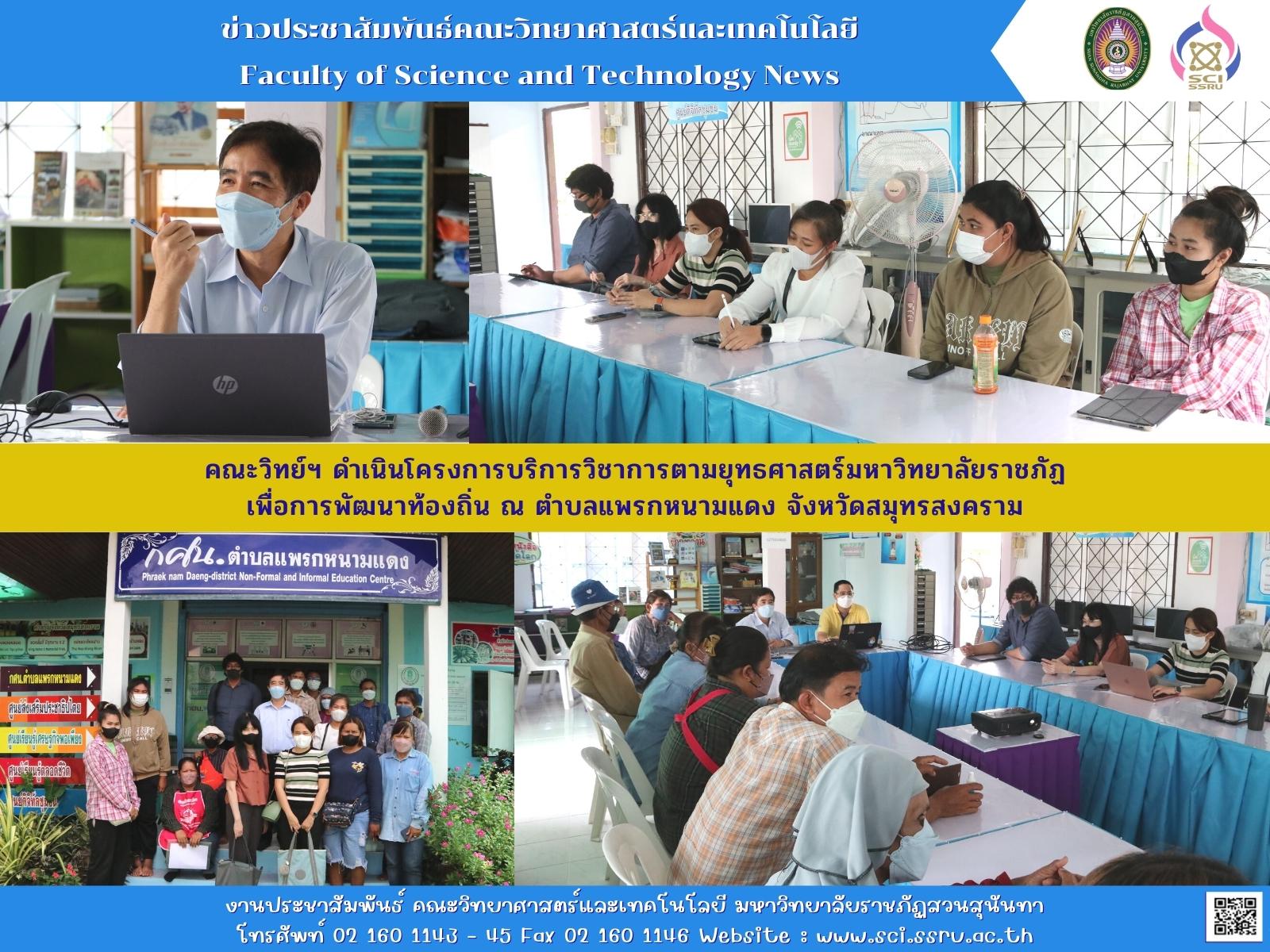 เมื่อวันศุกร์ที่ 28 ตุลาคม 2565 รองศาสตราจารย์ ดร.ชัยศรี ธาราสวัสดิ์พิพัฒน์ คณบดีคณะวิทยาศาสตร์และเทคโนโลยี พร้อมคณาจารยและเจ้าหน้าที่ ร่วมลงพื้นที่ตำบลแพรกหนามแดง จังหวัดสมุทรสงคราม ดำเนินการโครงการพัฒนาคุณภาพชีวิตและยกระดับรายได้คนในชุมชนฐานราก ด้วยวิทยาศาสตร์ เทคโนโลยี และนวัตกรรม (8 ครัวเรือน) ประจำปีงบประมาณ พ.ศ. 2566 ได้ร่วมประชุมกับวิสาหกิจชุมชนแพรกหนามแดง ผู้ประกอบอาชีพจำหน่ายปลาสลิด ณ ศูนย์ กศน.แพรกหนามแดง เพื่อชี้แจงแนวทางการดำเนินงานโครงการฯ และสอบถามความต้องการครัวเรือนที่เข้าร่วมโครงการฯ เพื่อวางแผนงานในการยกระดับรายได้ครัวเรือนต่อไป