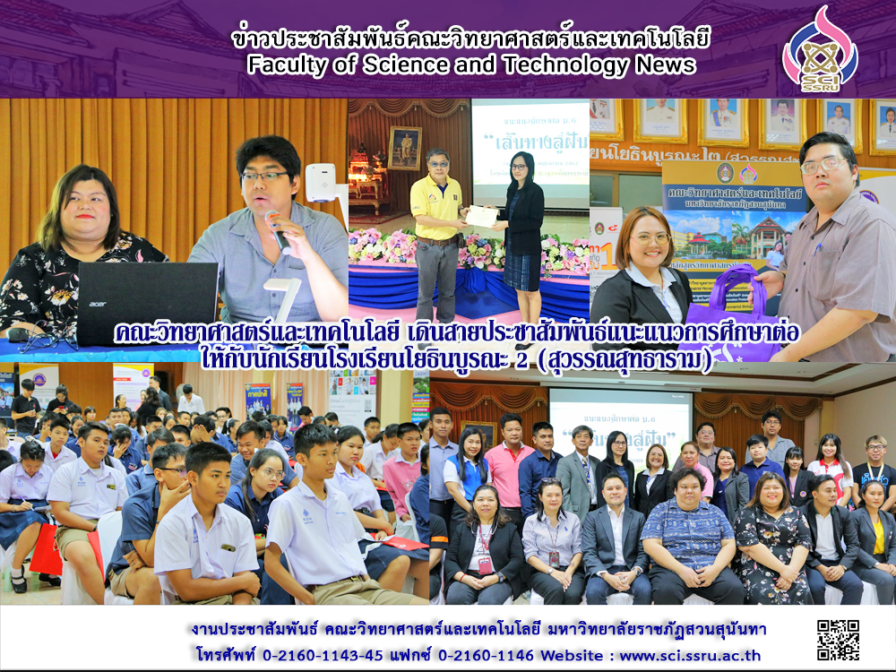 เมื่อวันที่ 26 พฤศจิกายน 2562 งานประชาสัมพันธ์ ร่วมกับ ฝ่ายบริการการศึกษา คณะวิทยาศาสตร์และเทคโนโลยี ได้จัดกิจกรรมเดินสายแนะแนวการศึกษาต่อ ให้กับนักเรียนโรงเรียนโยธินบูรณะ 2 (สุวรรณสุทธาราม) จังหวัดนนทบุรี นำทีม โดย ผู้ช่วยศาสตราจารย์อดิศัย โทวิชา รองคณบดีฝ่ายบริหาร และตัวแทนคณาจารย์ ได้แก่ อาจารย์ ดร.จิตรลดา ชูมี หัวหน้าสาขาวิชาเคมี และ อาจารย์ณัฐพล ประเทิงจิตต์ อาจารย์สาขาวิชาวิทยาศาสตร์และเทคโนโลยีการอาหาร ทั้งนี้ มีนักเรียนเข้าร่วมกิจกรรม เป็นจำนวน ทั้งสิ้น 60 คน