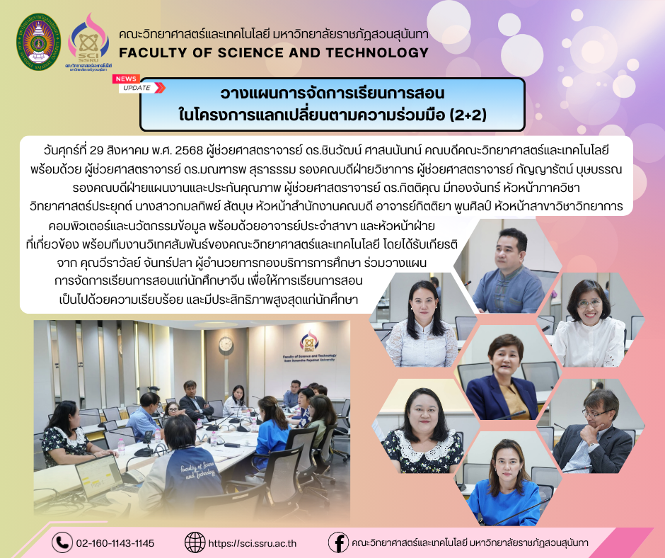 วันศุกร์ที่ 29 สิงหาคม พ.ศ. 2568 ผู้ช่วยศาสตราจารย์ ดร.ชินวัฒน์ ศาสนนันทน์ คณบดีคณะวิทยาศาสตร์และเทคโนโลยี พร้อมด้วย ผู้ช่วยศาสตราจารย์ ดร.มณฑารพ สุธาธรรม รองคณบดีฝ่ายวิชาการ ผู้ช่วยศาสตราจารย์ กัญญารัตน์ บุษบรรณ รองคณบดีฝ่ายแผนงานและประกันคุณภาพ ผู้ช่วยศาสตราจารย์ ดร.กิตติคุณ มีทองจันทร์ หัวหน้าภาควิชาวิทยาศาสตร์ประยุกต์ นางสาวกมลทิพย์ สัตบุษ หัวหน้าสำนักงานคณบดี อาจารย์กิตติยา พูนศิลป์ หัวหน้าสาขาวิชาวิทยาการคอมพิวเตอร์และนวัตกรรมข้อมูล พร้อมด้วยอาจารย์ประจำสาขาวิชา และหัวหน้าฝ่ายที่เกี่ยวข้อง พร้อมทีมงานวิเทศสัมพันธ์ของคณะวิทยาศาสตร์และเทคโนโลยี โดยได้รับเกียรติจาก คุณวีราวัลย์ จันทร์ปลา ผู้อำนวยการกองบริการการศึกษา ร่วมวางแผนการจัดการเรียนการสอนแก่นักศึกษาจีน เพื่อให้การเรียนการสอนเป็นไปด้วยความเรียบร้อย และมีประสิทธิภาพสูงสุดแก่นักศึกษา