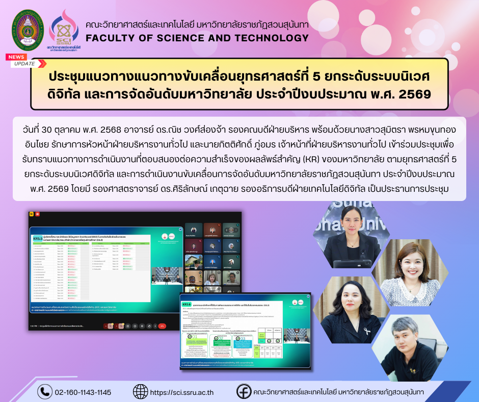 วันพฤหัสบดีที่ 30 ตุลาคม พ.ศ. 2568 อาจารย์ ดร.ณิช วงศ์ส่องจ้า รองคณบดีฝ่ายบริหาร พร้อมด้วยนางสาวสุมิตรา พรหมขุนทอง อินไชย รักษาการหัวหน้าฝ่ายบริหารงานทั่วไป และนายกิตติศักดิ์ ภู่อมร เจ้าหน้าที่ฝ่ายบริหารงานทั่วไป เข้าร่วมประชุมเพื่อรับทราบแนวทางการดำเนินงานที่ตอบสนองต่อความสำเร็จของผลลัพธ์สำคัญ (KR) ของมหาวิทยาลัย ตามยุทธศาสตร์ที่ 5 ยกระดับระบบนิเวศดิจิทัล และการดำเนินงานขับเคลื่อนการจัดอันดับมหาวิทยาลัยราชภัฏสวนสุนันทา ประจำปีงบประมาณ พ.ศ. 2569 โดยมี รองศาสตราจารย์ ดร.ศิริลักษณ์ เกตุฉาย รองอธิการบดีฝ่ายเทคโนโลยีดิจิทัล เป็นประธานการประชุม ซึ่งมีวัตถุประสงค์เพื่อพัฒนาโครงสร้างพื้นฐานด้านดิจิทัล เสริมสร้างสมรรถนะดิจิทัลของบุคลากรและนักศึกษา บูรณาการข้อมูลระบบบริหารจัดการและการเรียนการสอน เพื่อขับเคลื่อนมหาวิทยาลัยสู่การเป็นองค์กรดิจิทัลอย่างสมบูรณ์ การประชุมจัดขึ้นผ่านระบบออนไลน์ด้วยโปรแกรม Google Meet
