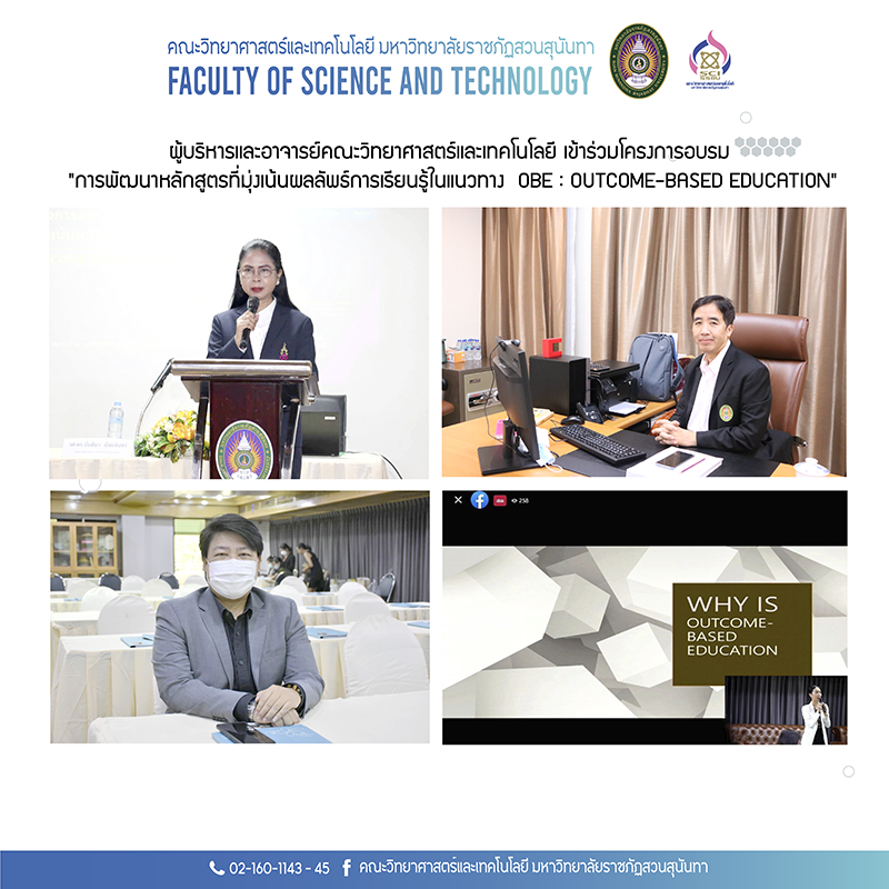 วันพุธที่ 30 พฤศจิกายน 2565 รองศาสตราจารย์ ดร.ชัยศรี ธาราสวัสดิ์พิพัฒน์ คณบดี พร้อมด้วย ผู้ช่วยศาสตราจารย์ ดร.โสพิศ สว่างจิตร รองคณบดีฝ่ายวิชาการ และอาจารย์คณะวิทยาศาสตร์และเทคโนโลยี เข้าร่วมโครงการอบรม "การพัฒนาหลักสูตรที่มุ่งเน้นผลลัพธ์การเรียนรู้ในแนวทาง OBE : OUTCOME-BASED EDUCATION" โดยมีรองศาสตราจารย์ ดร.นันทิยา น้อยจันทร์ รองอธิการบดีฝ่ายวิชาการ เป็นประธาน และ ผู้ช่วยศาสตราจารย์ ดร.ศุภวรรณ สัจจพิบูล เป็นวิทยากรบรรยาย ณ ห้องประชุมสุวพัฒน์นิเวศน์ คณะวิทยาการจัดการ และผ่านระบบออนไลน์