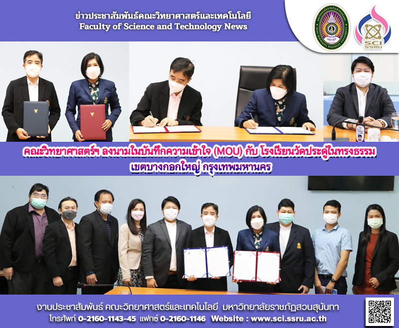 วันพฤหัสบดีที่ 31 มีนาคม 2565 คณะวิทยาศาสตร์และเทคโนโลยี ลงนามในบันทึกความเข้าใจ (MOU) ระหว่างมหาวิทยาลัยราชภัฏสวนสุนันทา โรงเรียนวัดประดู่ในทรงธรรม เขตบางกอกใหญ่ กรุงเทพมหานคร นำโดย รองศาสตราจารย์ ดร.ชัยศรี ธาราสวัสดิ์พิพัฒน์ คณบดีคณะวิทยาศาสตร์และเทคโนโลยี , ผู้ช่วยศาสตราจารย์ ดร.โสพิศ สว่างจิตร รองคณบดีฝ่ายวิชาการ พร้อมด้วยคณาจารย์และบุคลากร ณ โรงเรียนวัดประดู่ในทรงธรรม เขตบางกอกใหญ่ กรุงเทพมหานคร